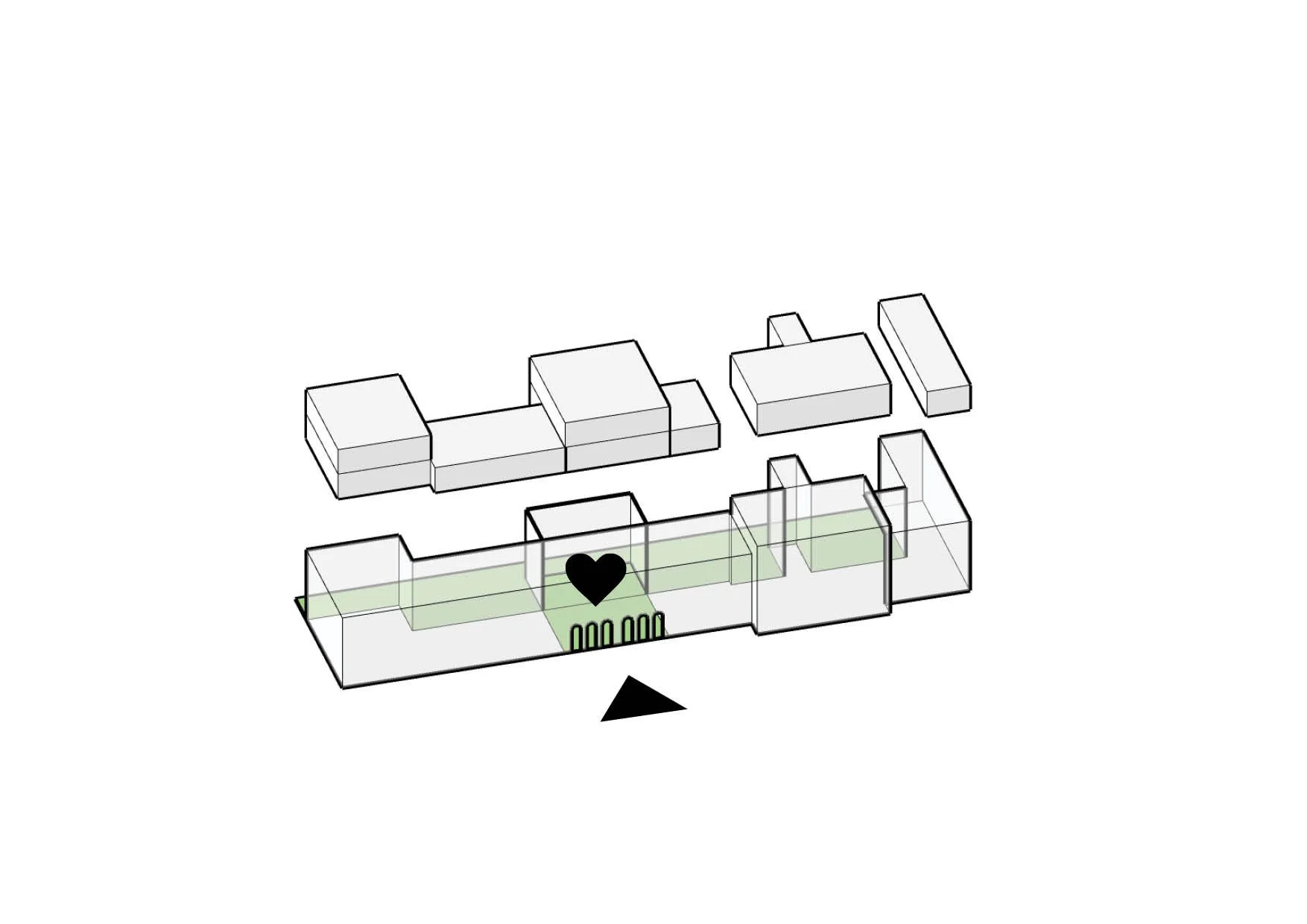 A new volume is proposed at the site of the collapsed wall. It will serve as the central circulation hub, connecting fragmented floors and improving navigation. The integration of a winter garden links the courtyard with the street, creating a welcoming public space and a symbolic “heart” of the future cultural and educational center.