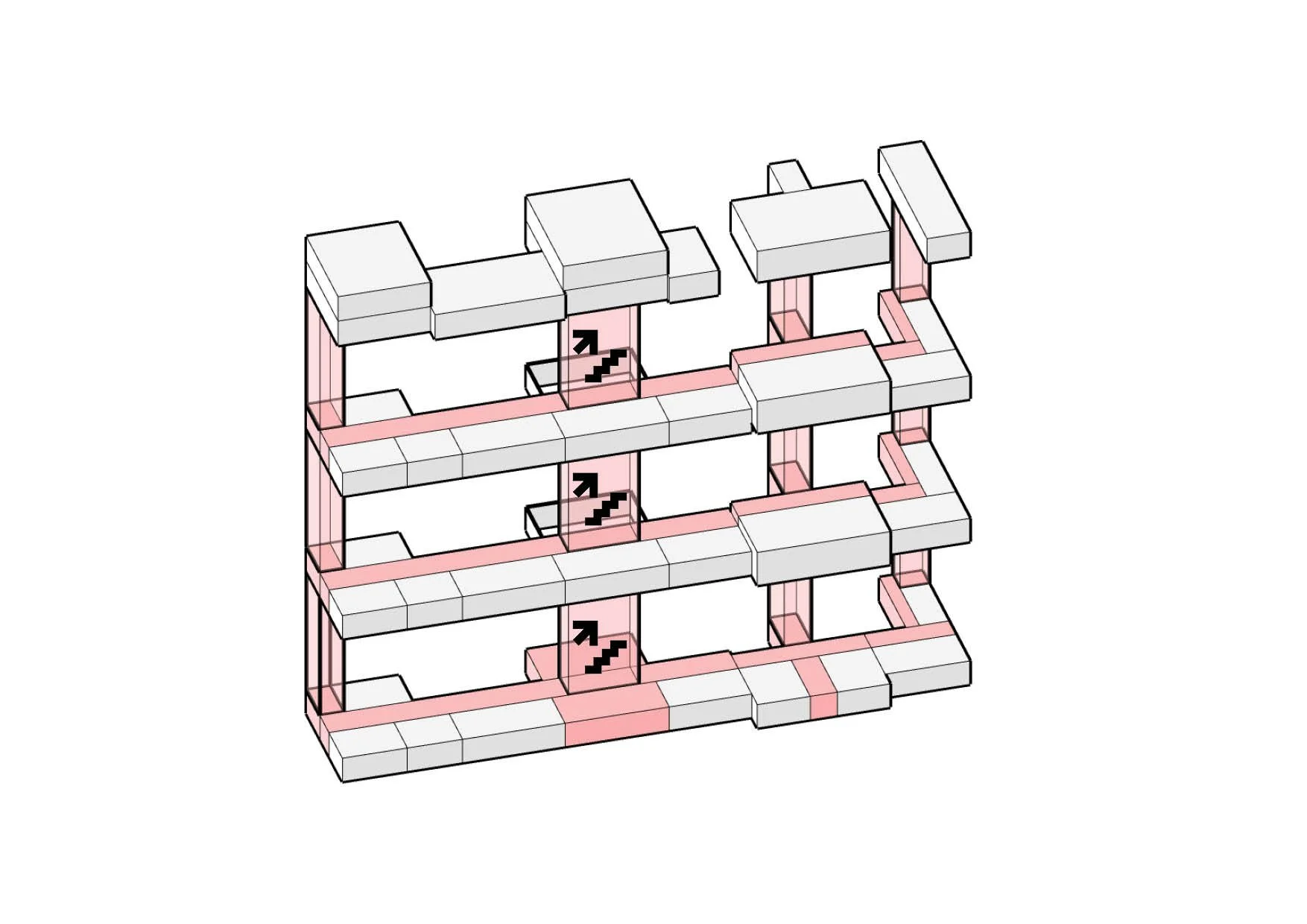 The transformation unfolds in three phases. Phase 1 restores the east wing, while the west remains a stabilized ruin for events. Phase 2 rebuilds the west wing, adding a winter garden and central staircase to improve circulation. Phase 3 adds lightweight prefabricated upper floors, expanding space without stressing the historic structure.
