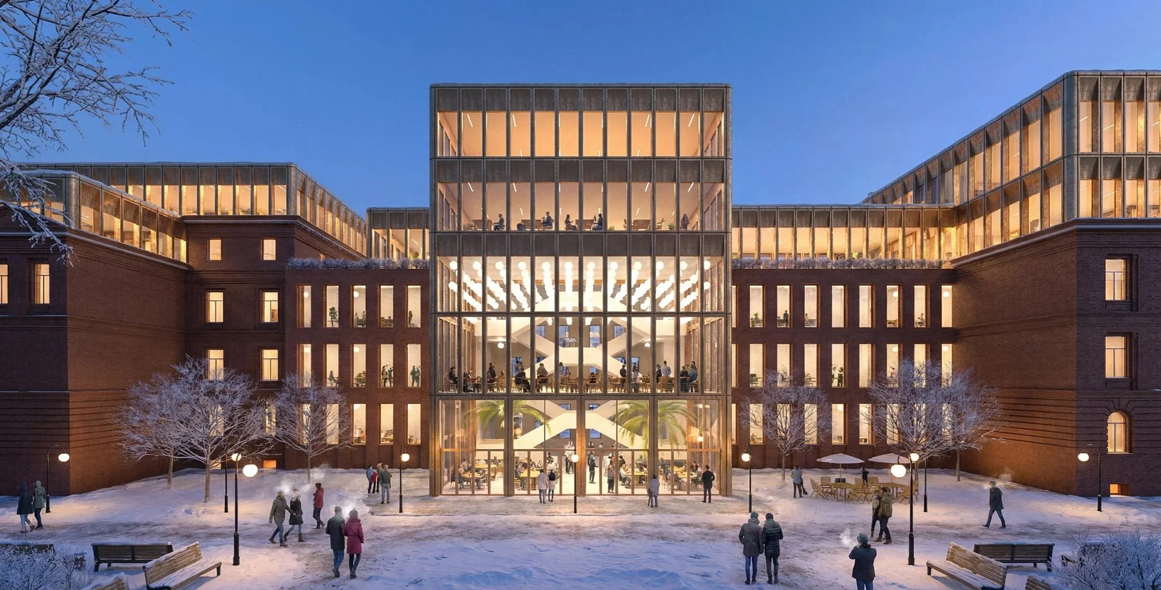 The project balances historical preservation with contemporary intervention. The surviving brick façades are carefully restored, while lightweight prefabricated additions provide new floors without overloading the structure. A transparent volume inserted at the site of a collapsed wall forms a winter garden and vertical circulation hub — the symbolic “heart” of the cluster. The program integrates shops, cafés, a library, event halls, creative studios, and offices, ensuring constant activity and economic sustainability. This approach reinforces Semey’s identity as a historic center of education while shaping a new future as a cultural and innovation hub.