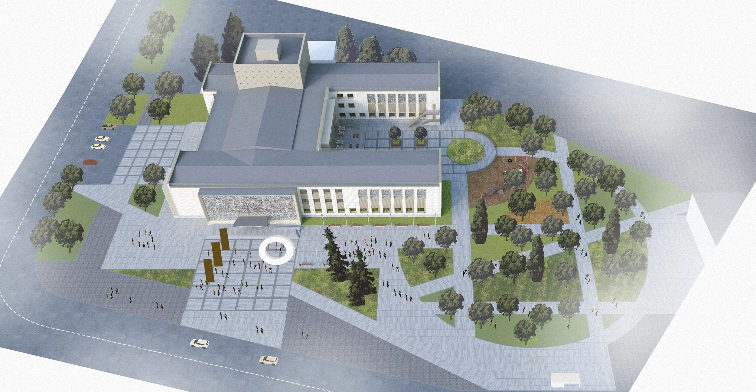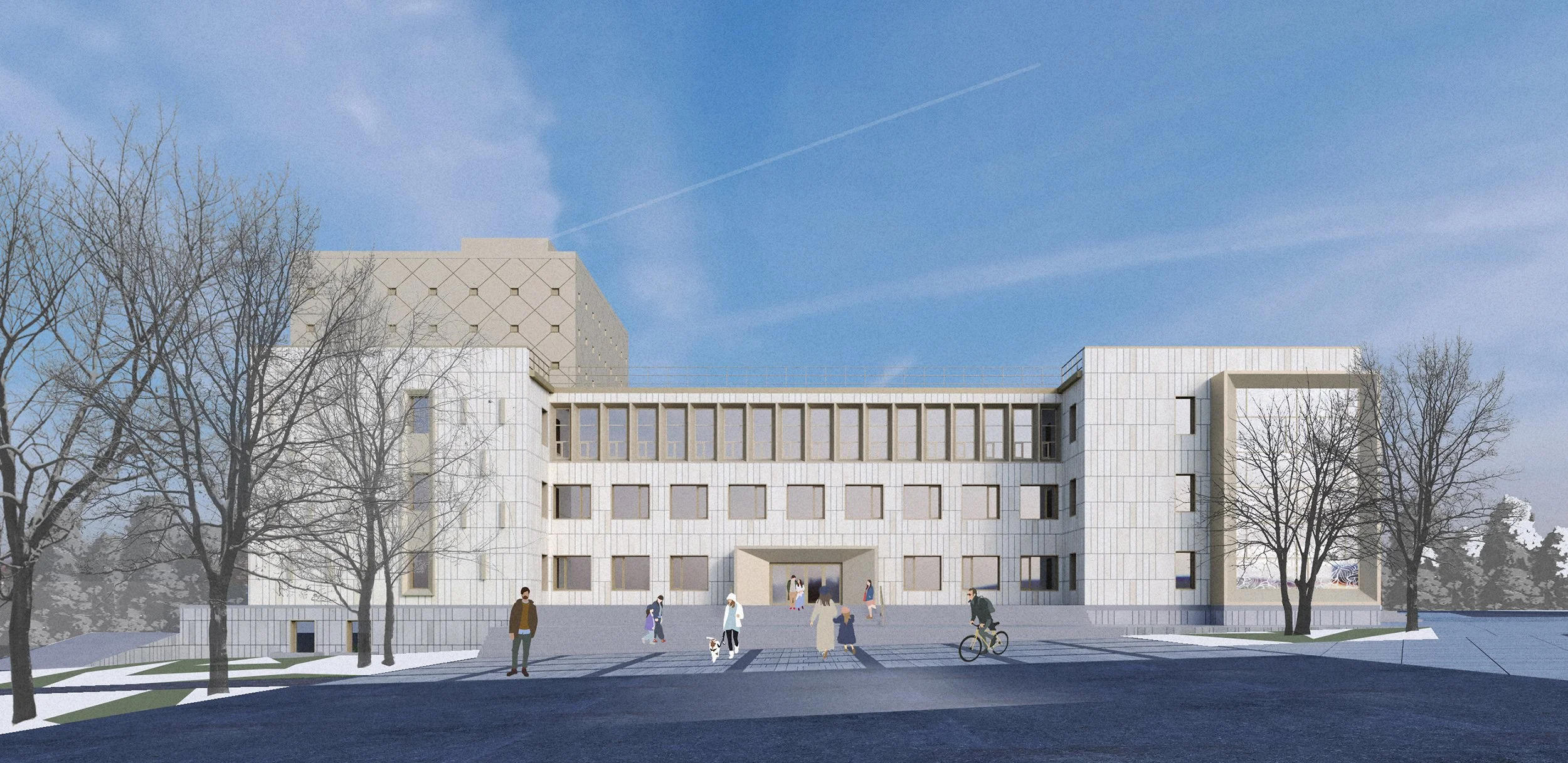 The design reorganizes the existing volumes into a multifunctional civic cluster.