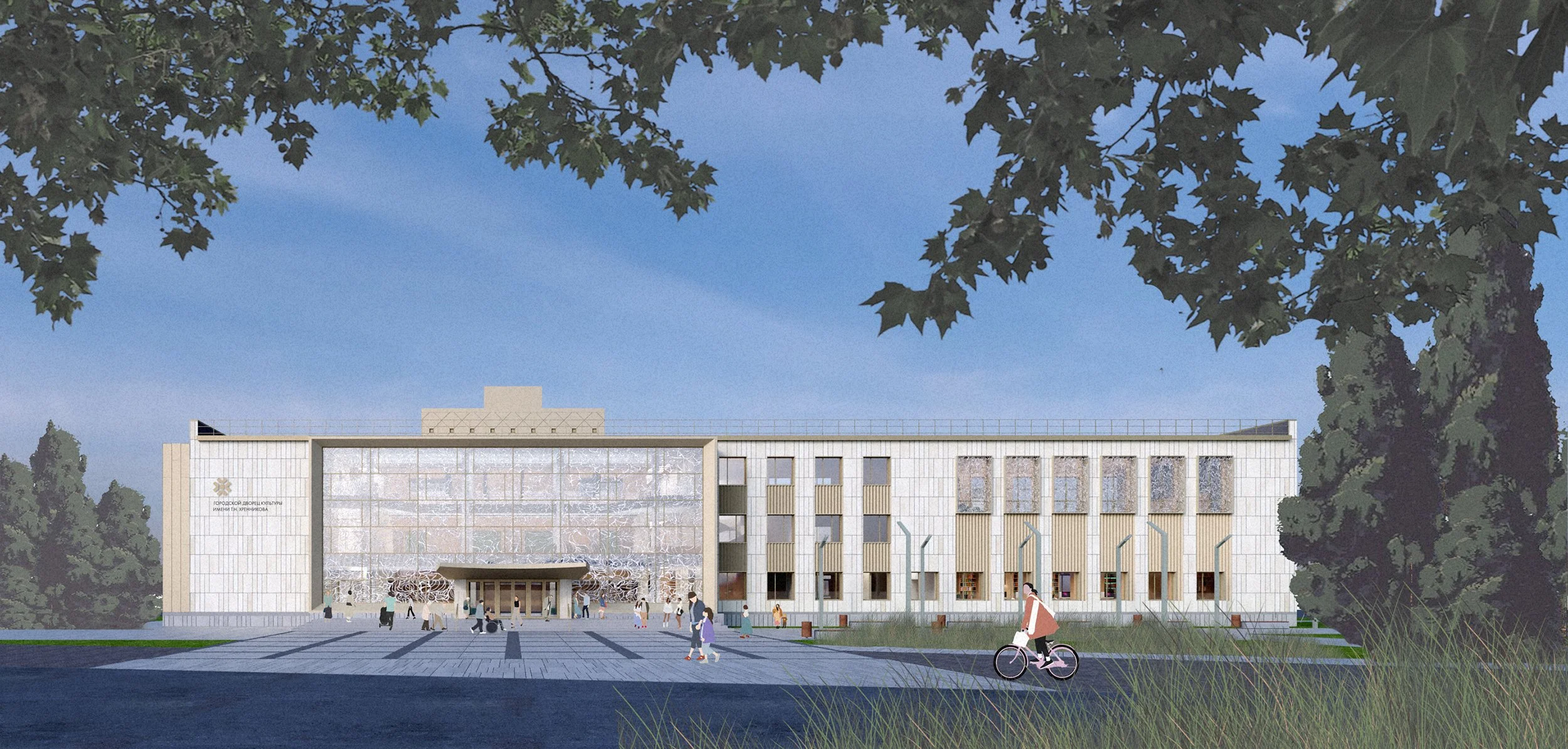 The renovation balanced preservation with local interpretation. The façades were renewed using natural stone quarried near Yelets, combined with anodized aluminum elements. Glazing incorporates patterns inspired by the city’s lace-making traditions — a subtle yet distinctive link to regional heritage.