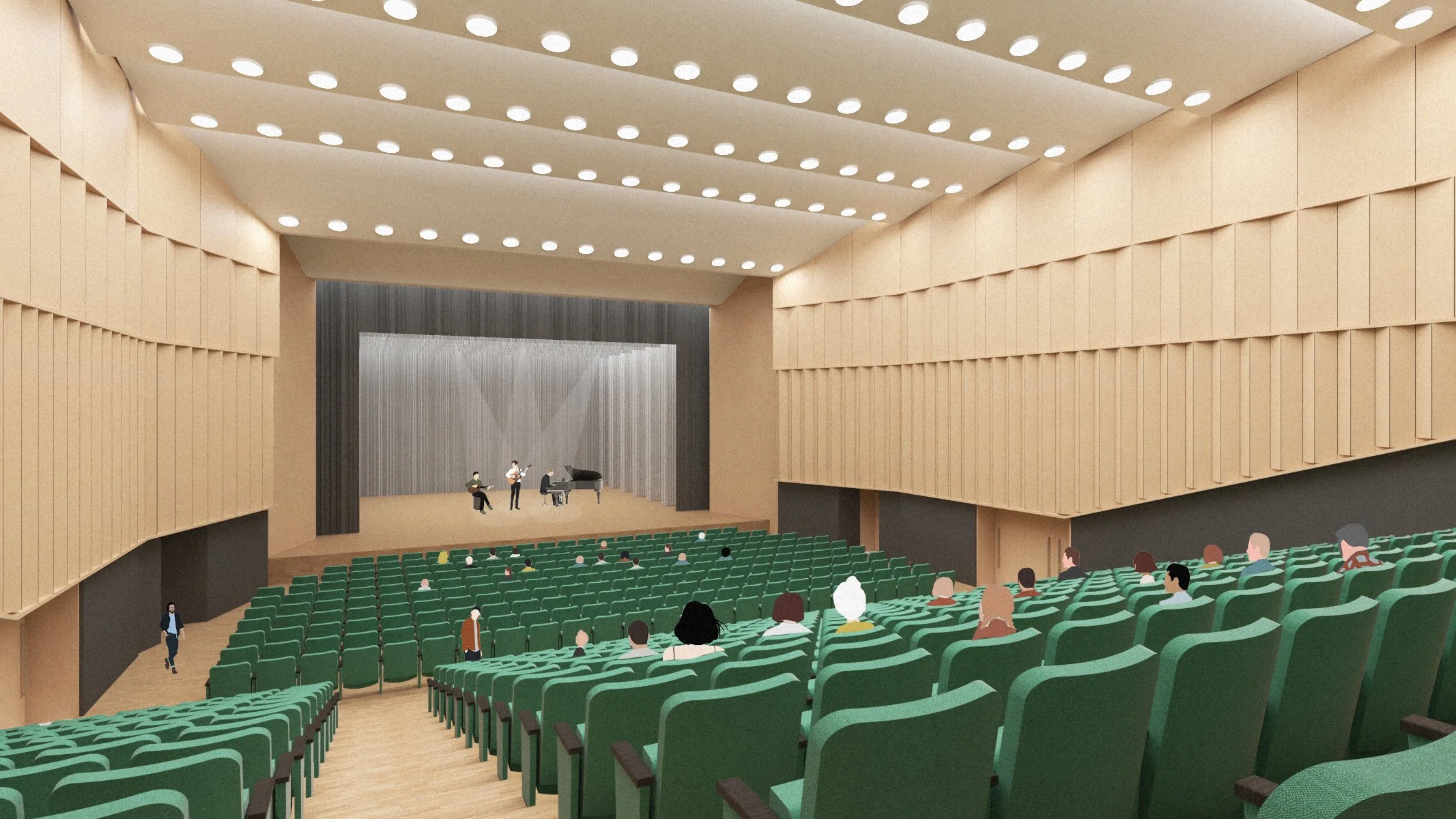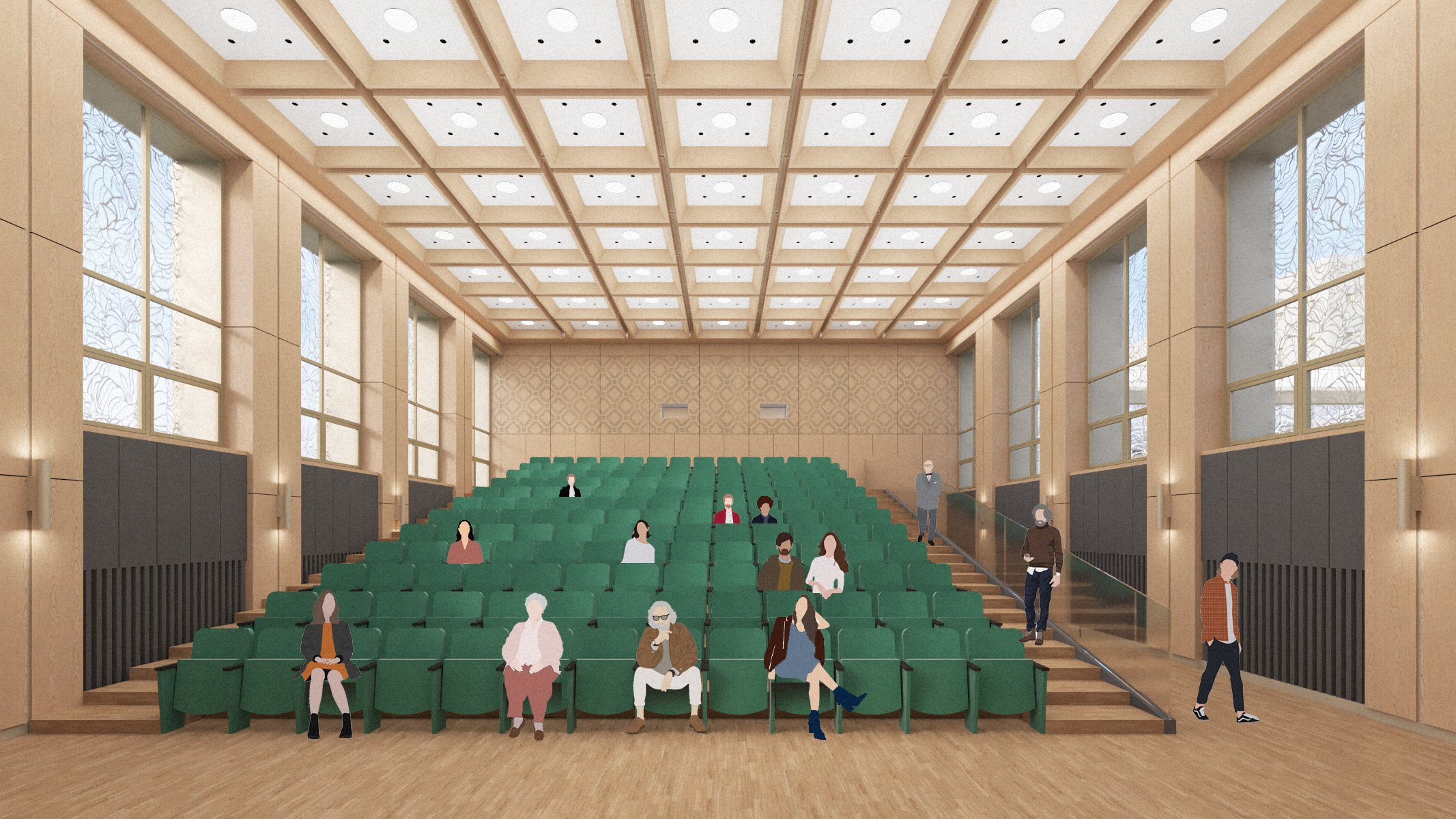 The 623-seat auditorium was upgraded with acoustic wall panels, timber finishes, and new lighting to improve comfort and technical performance, while preserving its spatial clarity. The smaller hall and rehearsal spaces were also reconfigured and improved, expanding the building’s cultural capacity.