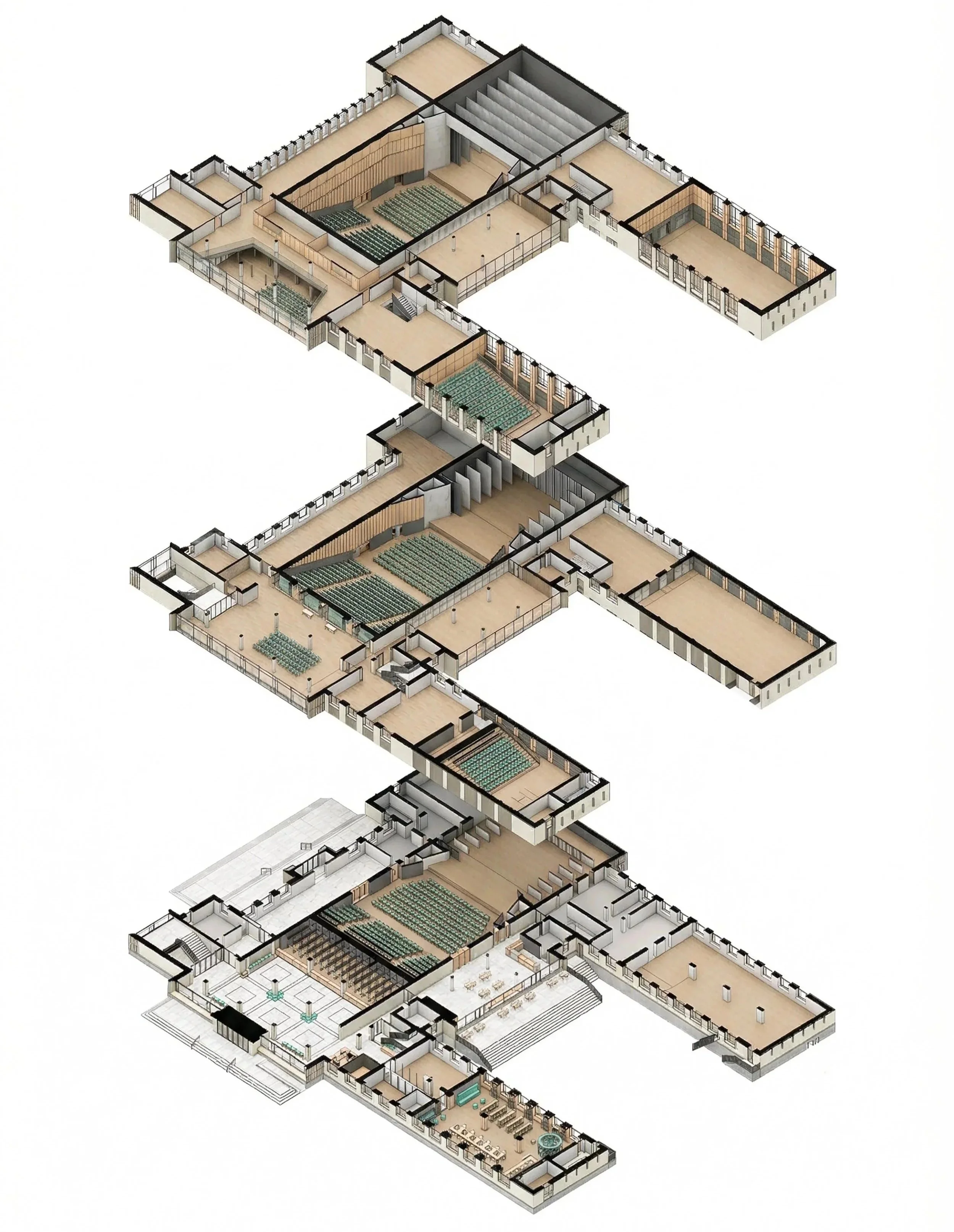 Upper floors: small auditorium, rehearsal studios, music school, and offices.